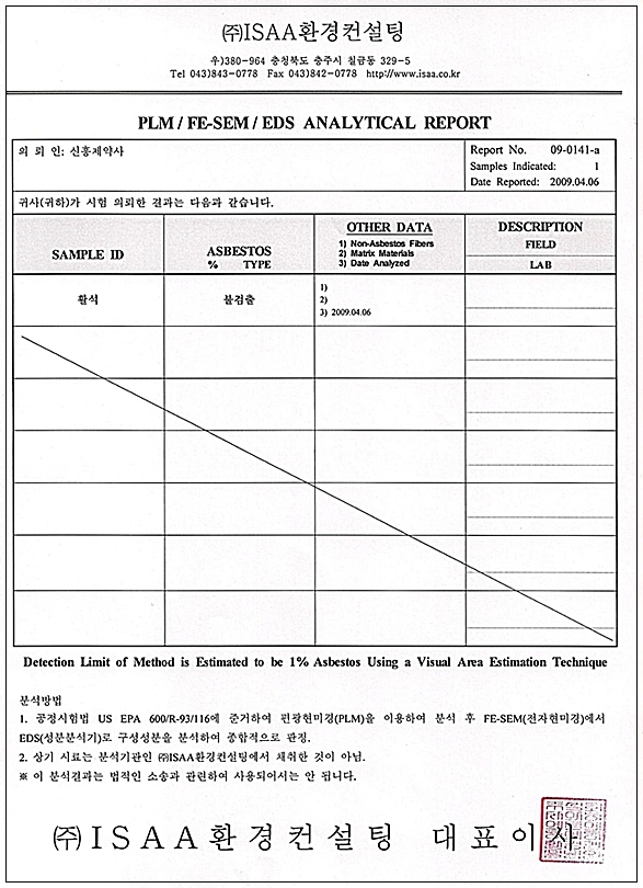 | [식품의약품 안전청] 에서 금번에 실시한 활석제품의 잔류(석면) 시험 검사를 진행하는 과정에서 "활석(신흥)"제품을 04월04일(토)Am12:00 에 식약청에서 수거, 표준 시료를 수거하여 식약청주관하에 시험한 결과 04월06일(월)Pm06:00 경 최종적으로 [신흥"활석" 성분중 (석면)불검출]통보를 받았습니다. 또한 이와는 별도로 (주)ISAA환경 컨설팅 등 국가공인 시험기관 2곳에도 시험의뢰한 결과 2곳 모두에서 (석면)불검출 확인을 받았습니다. 아래의 내용과 같이 신흥"활석"은 안전성이 확인된 제품이오니 안심하고 사용하시기 바랍니다. ![]() |