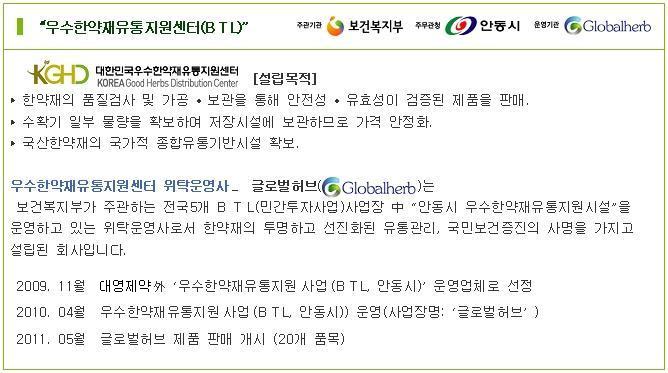 ![]() 우수한약재유통지원센터 위탁운영사_ 글로벌허브 글로벌허브 제품 '6월1일부터 순차적 판매~ ![]() ▷우수한약재 "글로벌허브" 제품을 순차적으로 판매하겠습니다. 대 영 제 약(주) ![]() |