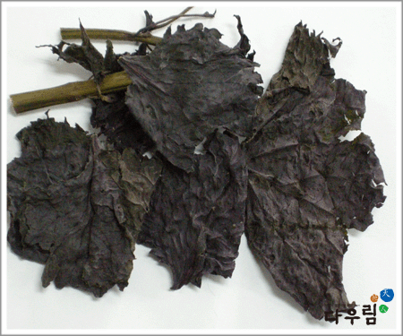 이 약은 주름지고 쭈그러진 잎과 그 파편이며 때때로 가는 줄기를 가진다. 잎은 양면이 모두 갈색을 띤 자색이거나 윗면은 회록색~녹갈색이고 뒷면은 갈색을 띤 자색을 띤다. 형체가 고른 잎을 물에 담그어 주름을 펴 보면 엽신은 넓은 난형~도심장형이고 끝쪽은 약간 뾰족하며 엽연에는 톱니가 있다.