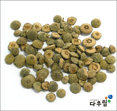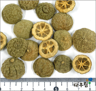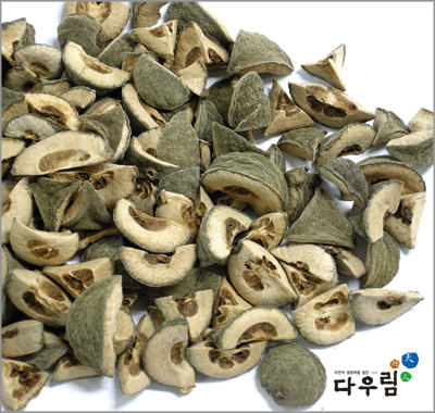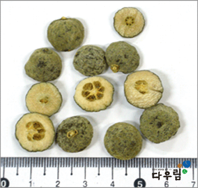이 약은 거의 구형이고 지름은 1~2cm이다. 바깥면은 진한 갈색~갈색을 띠며 거칠고 유실에 의한 오목한 작은 점이 많다. 횡단면의 표피쪽은 황갈색이고 안쪽은 엷은 회갈색을 띠고 중심부에는 방사상으로 8~16개의 작은 방으로 되어 있고 각 방은 말라서 황갈색을 띠며 오목하게 들어가고 간혹 덜익은 씨가 들어 있다.