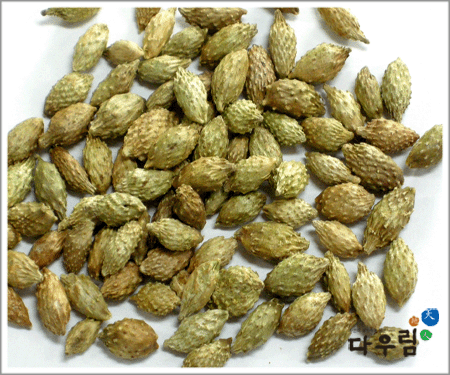 이 약은 긴 난원형으로 양끝이 뾰족하고 한쪽에는 2개의 부리가 있고 전체에 가시가 돋아 있다. 바깥면은 회흑색~황갈색이고 속은 2개의 방으로 나뉘어져 있고 그 안에 흑색의 납작한 씨가 1개씩 들어 있다.