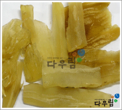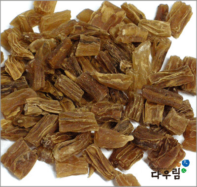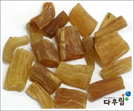 이 약은 방수형~원주형을 이루고 대개는 구부러져 있다. 길이 2~10 cm, 지름 2~3 cm이다. 바깥면은 황백색~엷은 갈색으로 반투명하여 때때로 세로주름이 있다. 질은 부드러우나 단단한 것도 있어 꺾이기 쉽고 꺾인면은 회황색이며 윤기가 있고 각질이다