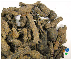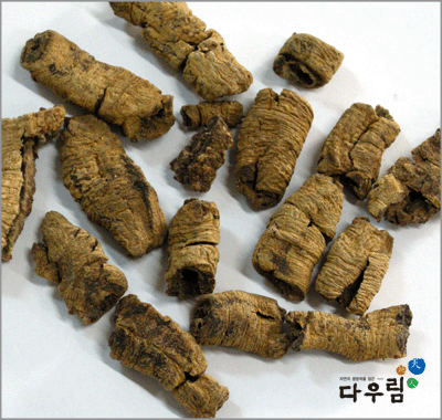 이 약은 굽은 원주형으로 길이는 일정하지 않고 지름 1~2cm이다. 바깥면은 엷은 자색~회갈색이며 거칠고 얕은 가로주름과 깊은 세로주름이 나 있고 피부가 갈라져 목부가 노출된 것도 있다. 꺾은면은 고르지 않고 피부는 엷은 자갈색이고 목부는 황색~황갈색이며 피부는 목부의 2개가량 된다.