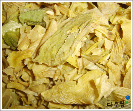 이 약은 부서진 원형의 조각으로 고르지 않으며, 물결 모양의 주름이 있다. 바깥면은 황금색~황갈색이며 너비 3~5cm, 두께 2~3mm이다. 꺾은면은 교질상으로 광택이 있고 질은 딱딱하며 부서지기 쉽다. 비린내가 조금나고 맛은 조금 쓰다.