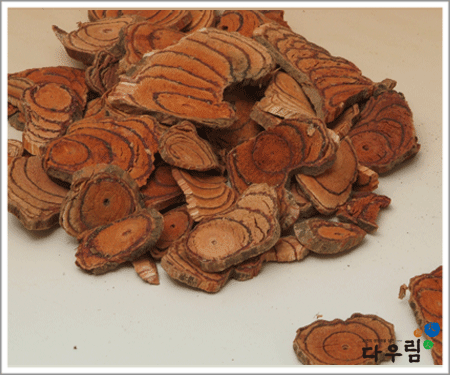 납작한 원주형으로 다소 구부러졌으며 길이 30~40cm, 지름 3~5cm이다. 바깥면은 회갈색이지만 코르크층을 제거한 것은 적갈색으로 세로홈과 가로피목이 있고 마디는 다소 돌출했으며 가지의 흔적이 있는 것도 있다. 꺾은면의 중앙에는 한쪽으로 기울어진 작은 수가 있으며 목부는 엷은 적갈색이고 사부는 적갈색~흑갈색의 둥근 고리를 이루고 있다. 사부의 바깥쪽에에는 다시 목부와 사부가 교대로 배열한 동심상의 반원형의 고리를 볼수 있다. 신선한 것은 적갈색의 닭의 피같은 고운 홍색의 액즙이 흘러 나온다. 이 액즙은 마르면 굳어지고 딱딱해지며, 꺾으면 박편상으로 된다.
