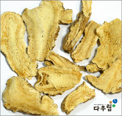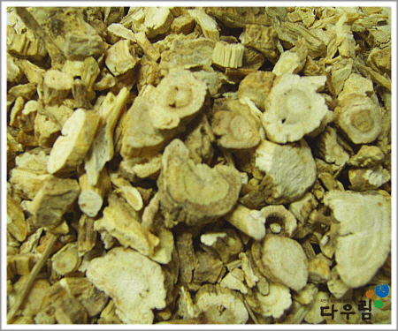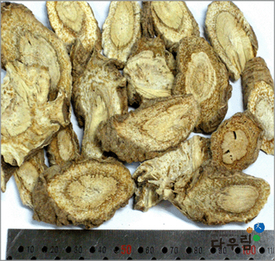 약재의 형태는 긴 원주형~막대모양이고 길이 10~30cm, 지름 5~20mm, 바깥면은 회백색 ~ 회갈색이며 세로주름과 잔뿌리의 자국이 있다. 꺾은면은 섬유성이고 엷은 회황색의 나이테 모양의 테가 있고 질은 가볍고 엉성하다. 특이한 방향이 있고 맛은 텁텁하며 좀 쓰다.