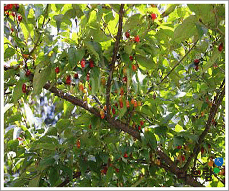 열매는 긴 타원형이며 약간의 단맛과 함께 떫고 강한 신맛이 난다. 독이 없으며 과육에는 로가닌, 코르닌, 모로니사이드, 타닌, 사포닌 그 밖에 비타민A 등을 함유하고 있다.