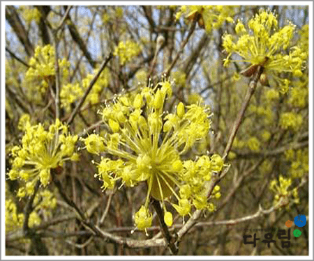 산수유나무는 우리나라 중부이남에서 흔히 관상수로 심고 있는 층층나무과의 낙엽교목으로 나무껍질이 벗겨지며 연한갈색이고 3~4월에 잎이 나오기 전에 먼저 노란색의 꽃이 피며 열매를 맺는데, 타원형의 핵과(核果)로서 처음에는 녹색이었다가 8~10월에 붉게 익는다.