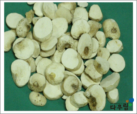 이 약은 약간 편압된 구형이거나 불규칙한 모양이며 바깥면은 흰색~회황백색이고 위쪽에는 줄기의 자국이 오목하게 남아있으며 그 주변에는 뿌리의 자국이 작은 점으로 남아 있다.